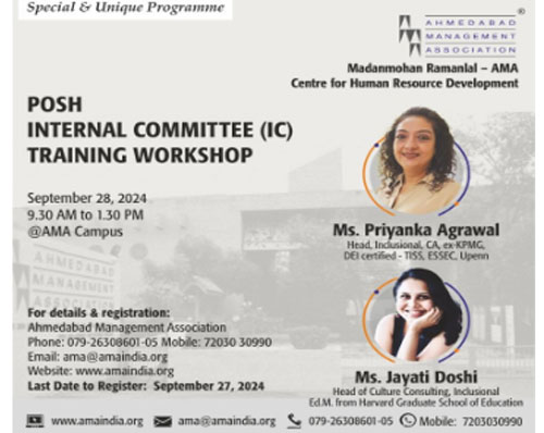 Trainer: POSH Internal Committee training, September 28, 2024, Ahmedabad Management Association. Creating culture custodians who understand prevention, prohibition and redressal as required by the mandatory POSH Act.