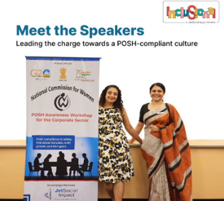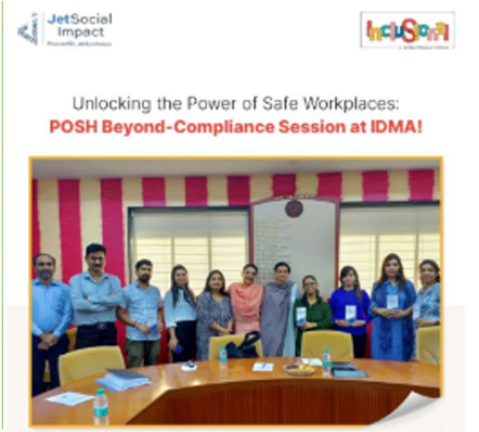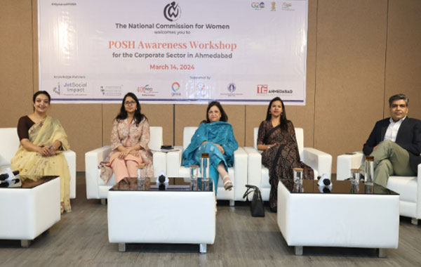 Trainer: POSH awareness workshop for the National Commission for Women at the Ahmedabad Management Association, Mar 24. Covered compliance essentials, and highlighted workplace safety as a foundation for ESG and inclusion strategies.